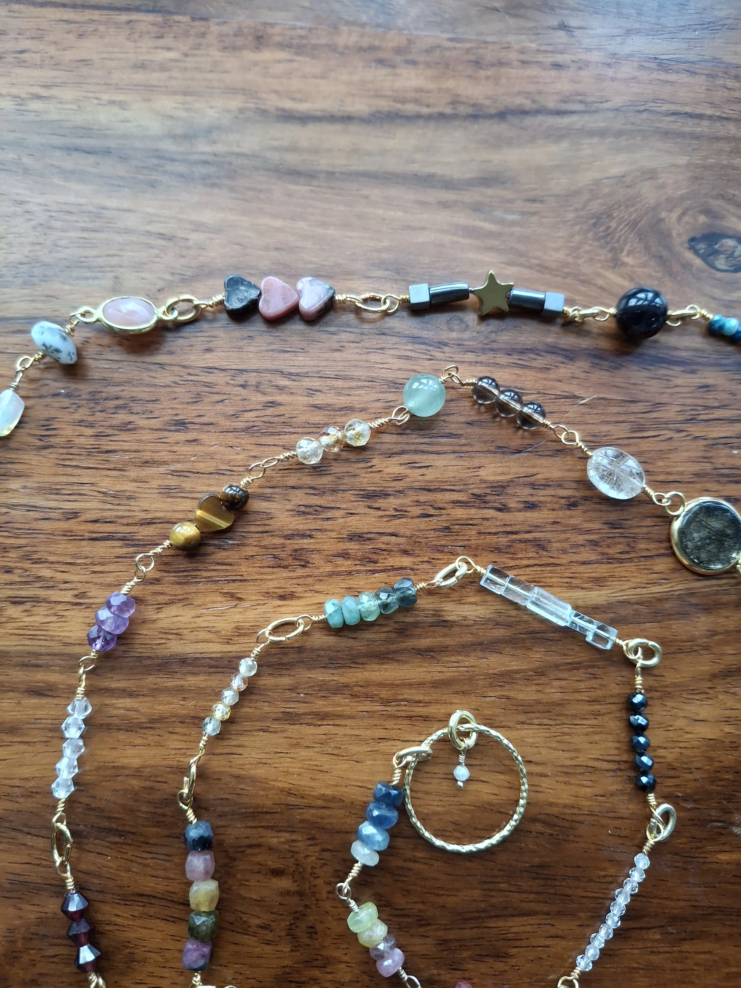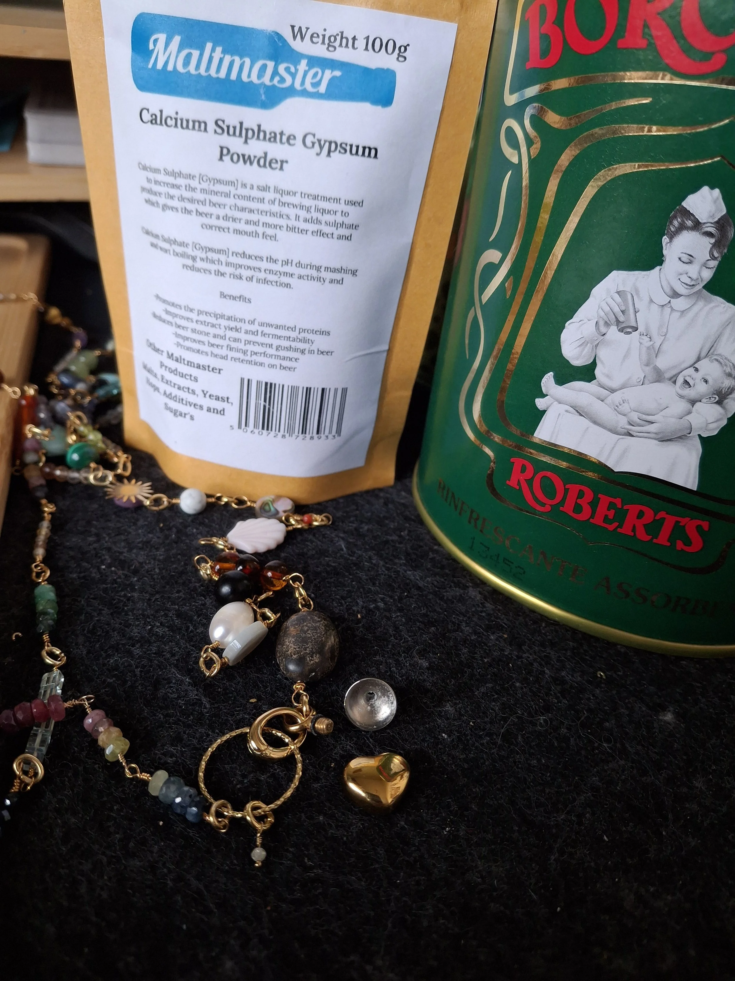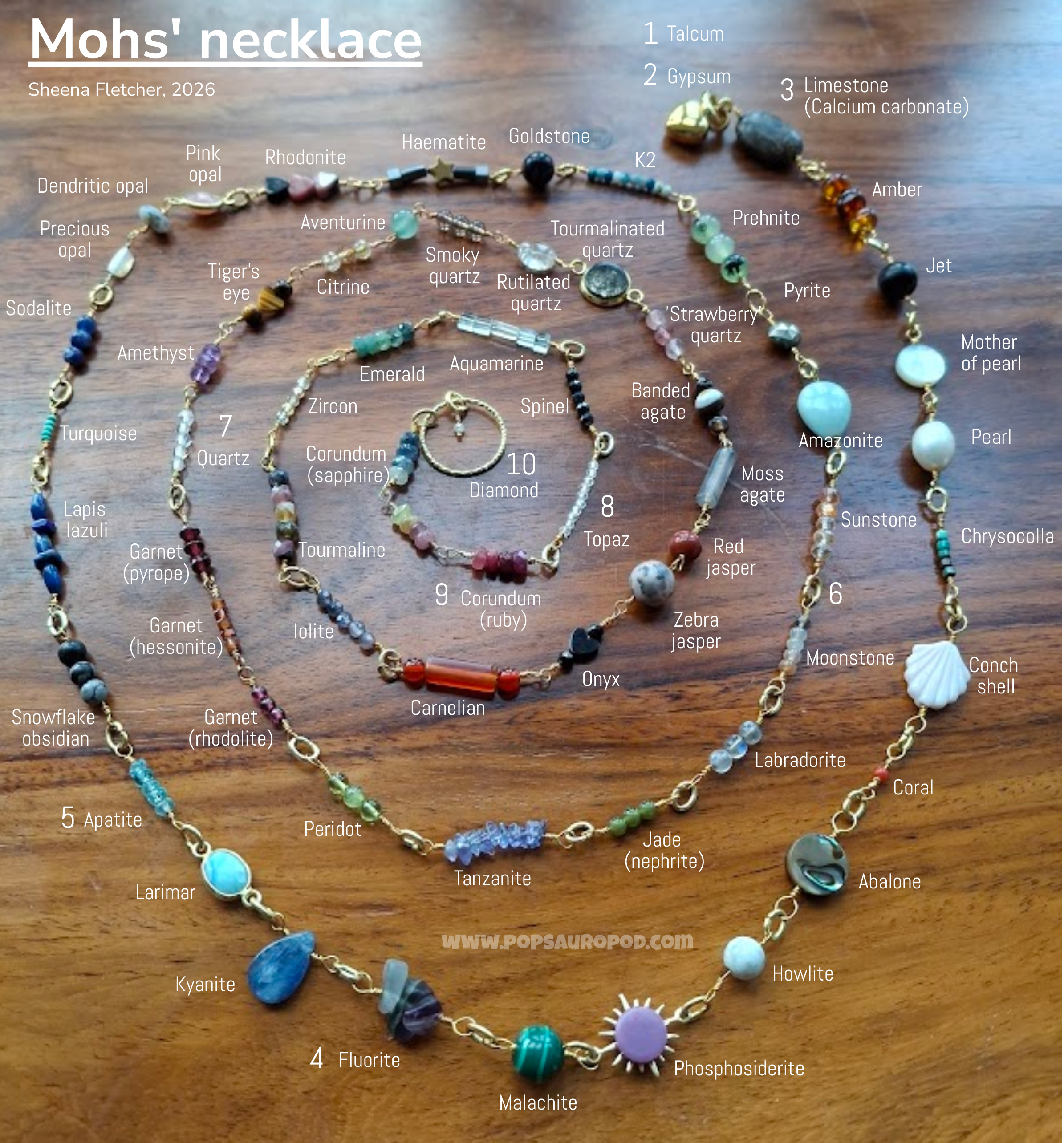 The necklace currently comprises 60 different gems; well, 58 recognisable gems and two mineral powders. The Mohs scale starts with talcum at number 1 and gypsum at number two, which are both far too fragile to use as beads, so I included them inside a gold-plated heart locket normally used for cremation ashes.